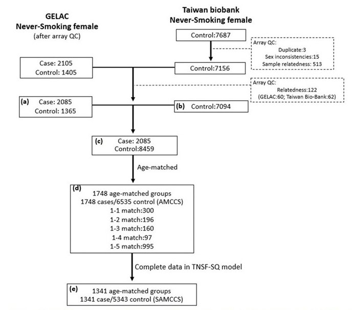 Dr. Li-Hsin Chien and Dr. Chao A. Hsiung from the Institute of Population Sciences, together with Dr. I-Shou Chang from the National Institute of Cancer Research and collaborators utilized data on NSFs in the Taiwan Genetic Epidemiology Study of Lung Adenocarcinoma and the Taiwan Biobank before August 2016 to form an age-matched case–control study consisting of 1,748 patients with lung cancer and 6,535 controls. Using these and an estimated age-specific lung cancer 6-year incidence rate among Taiwanese NSFs, the team developed the Taiwanese NSF Lung Cancer Risk Models using genetic information and simplified questionnaire (TNSF-SQ). Performance evaluation was based on the newer independent datasets: Taiwan Lung Cancer Pharmacogenomics Study (LCPG) and Taiwan Biobank data after August 2016 (TWB2).